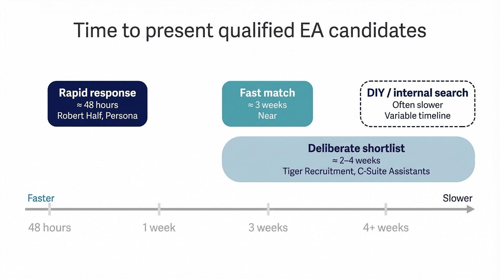 Boutiques work more deliberately yet still beat do-it-yourself hiring. A curated agency such as Tiger Recruitment or C-Suite Assistants usually delivers a refined shortlist in two to four weeks, a window many leaders accept when long-term fit matters.