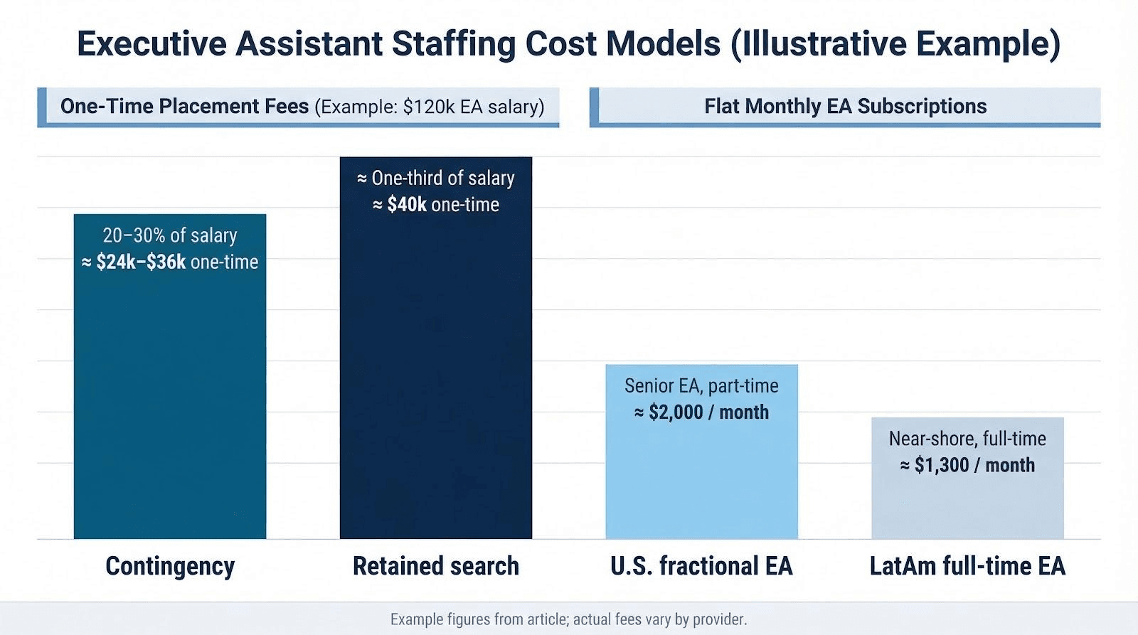Fees in the staffing world look simple until you read the fine print. Traditional contingency firms charge a one-time placement fee between 20 and 30 per cent of your EA's first-year salary, payable only when you hire (AIJourn). On a $120,000 assistant, that equals about $24,000–$36,000.
